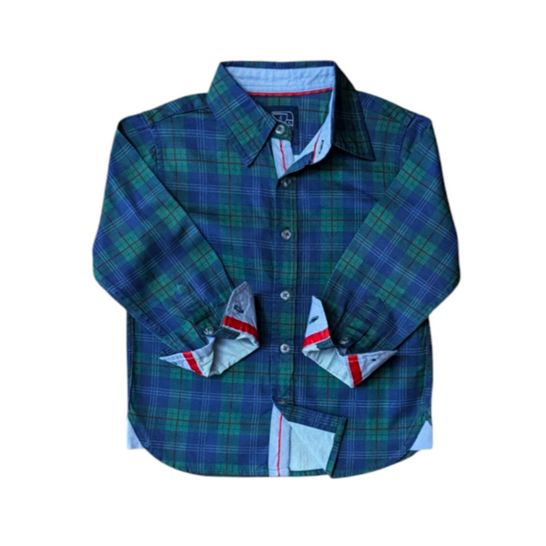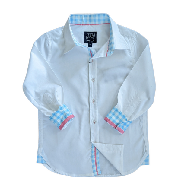 White Shirt with Blue Gingham Trim in Long Sleeves