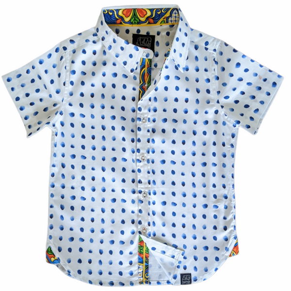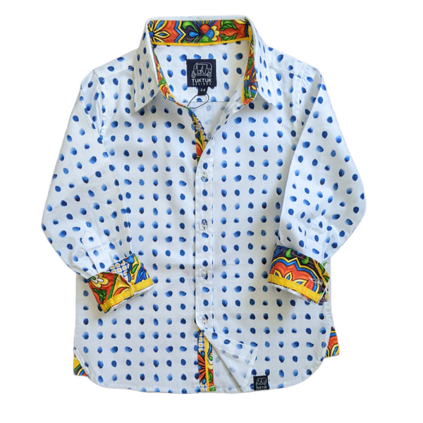 Blue Shirt with Pink Ikat Trim in Long Sleeves