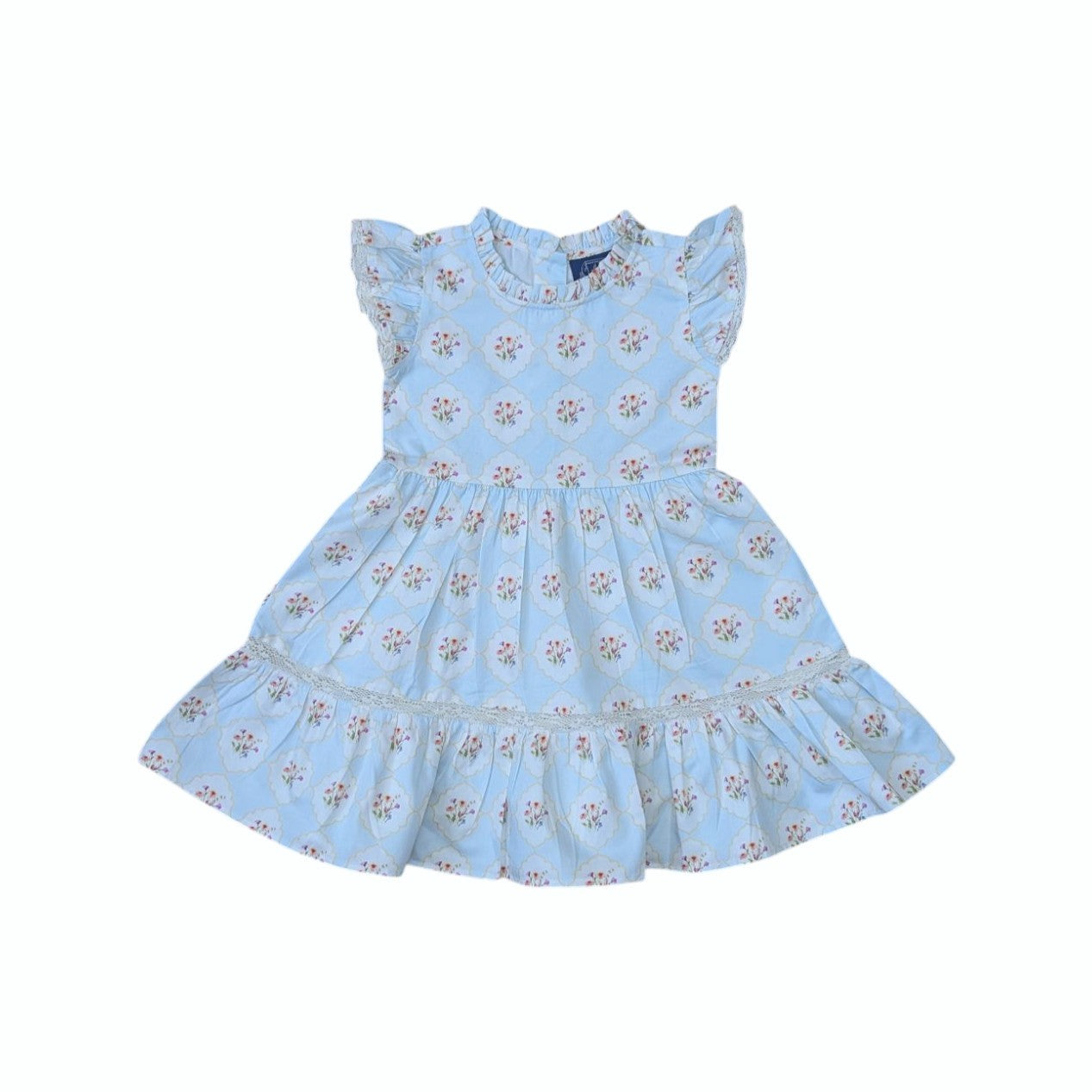 evoking a vintage-inspired garden feel. Whimsical lace trim at the flutter sleeves and along the tiered skirt adds a touch of vintage sweetness, while the easy silhouette keeps it perfectly playful for sunny days and special moments alike.