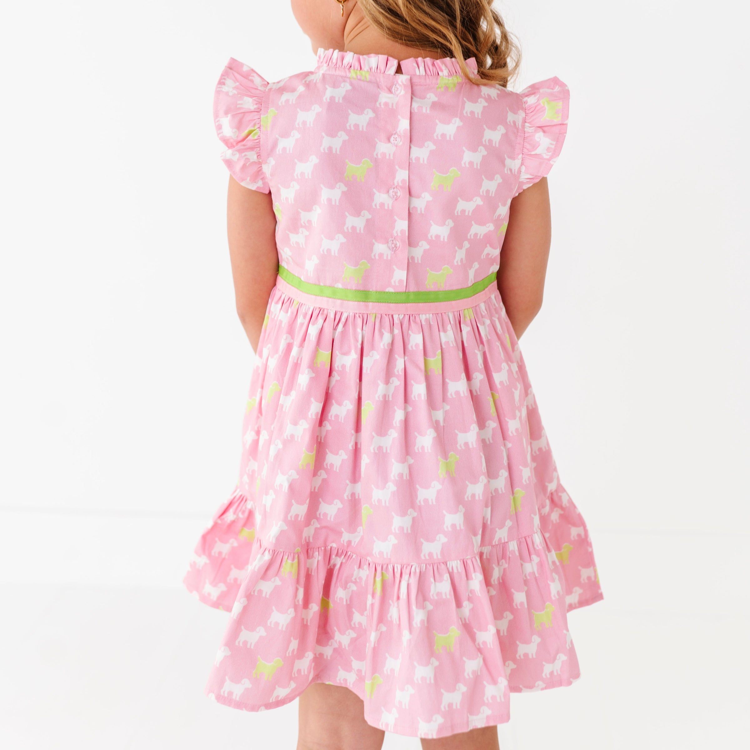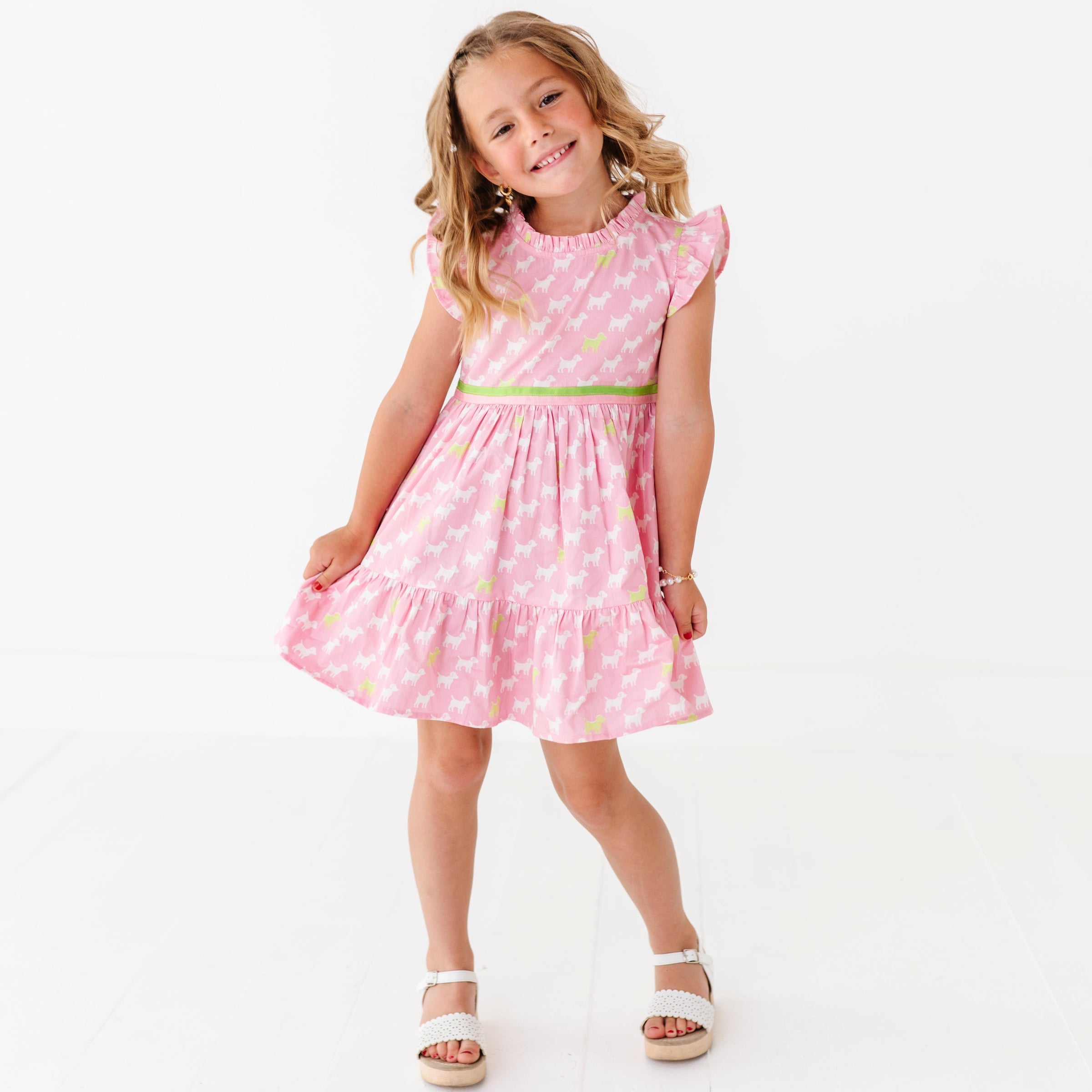 Sweet, playful, and perfectly polished, this charming pink dress is sprinkled with whimsical puppies for an irresistibly darling look. Designed with flutter sleeves and a full, gathered skirt made for carefree twirls, it’s finished with a double grosgrain ribbon at the waist for a crisp, tailored touch. Perfect for birthday parties, picture days, and puppy-love moments all season long
