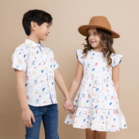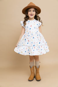 Saddle up in style! This Western-themed dress is a rootin'-tootin' favorite, featuring playful prints of cowboy boots, hats, horseshoes and sheriff badges. Perfect for little wranglers! Made from soft, breathable fabric, it’s designed for all-day comfort with delicate ruffles and piping for extra flair.